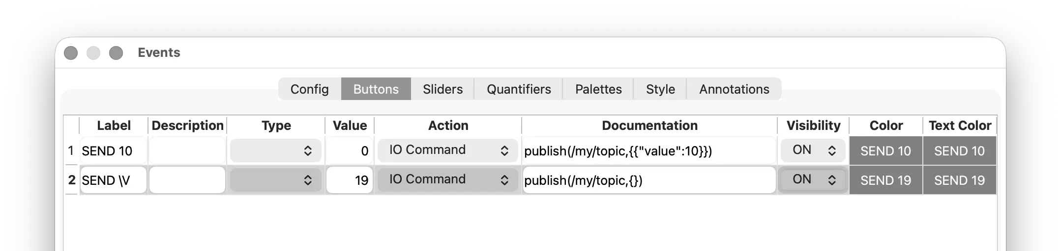 sends the button’s value (here 19) to the same topic /my/topic. Note that the placeholder symbol {} (no quoting here!) gets substituted by the button value in button actions.